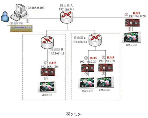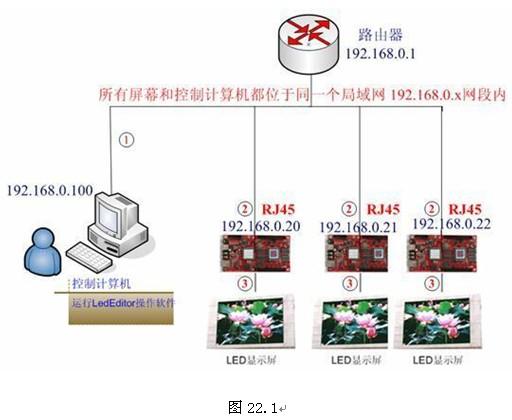 一、 说明 多块 LED 显示屏的局域网控制一般包括两种方案: 方案一:所有 LED 显示屏和控制计算机位于同一个局域网内部, 如图 22.1 方案二:LED 显示屏和控制计算机位于不同的局域网之间,如图 22.2
