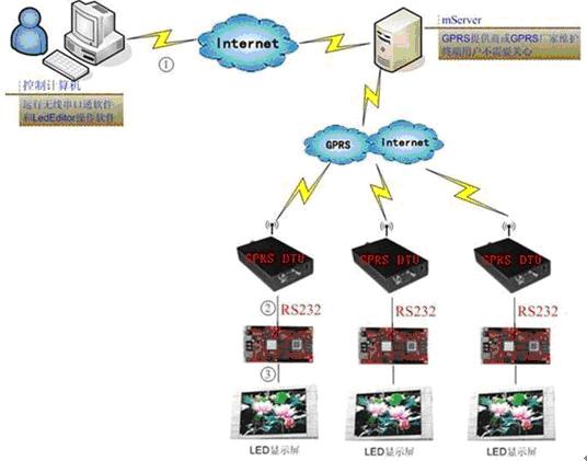 LED 显示屏的用途越来越广,一些广告屏或者交通屏等,由于数量多,分 布广,布线不方便,为解决这些难题,我公司成功研发了基于 GPRS 的 LED 显 示屏控制方案, 只要用户电脑能接入互联网,就能通过互联网找到接入 GPRS 网 络的控制卡,并控制显示屏的显示内容,实现异地控制,解决远距离传输和用一 台电脑控制多个 LED 显示屏的难题。